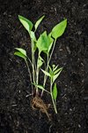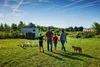 A man standing outdoors on a farm in front of newly planted small plants, with a green tractor in the background and a large tree behind him. View fullsize