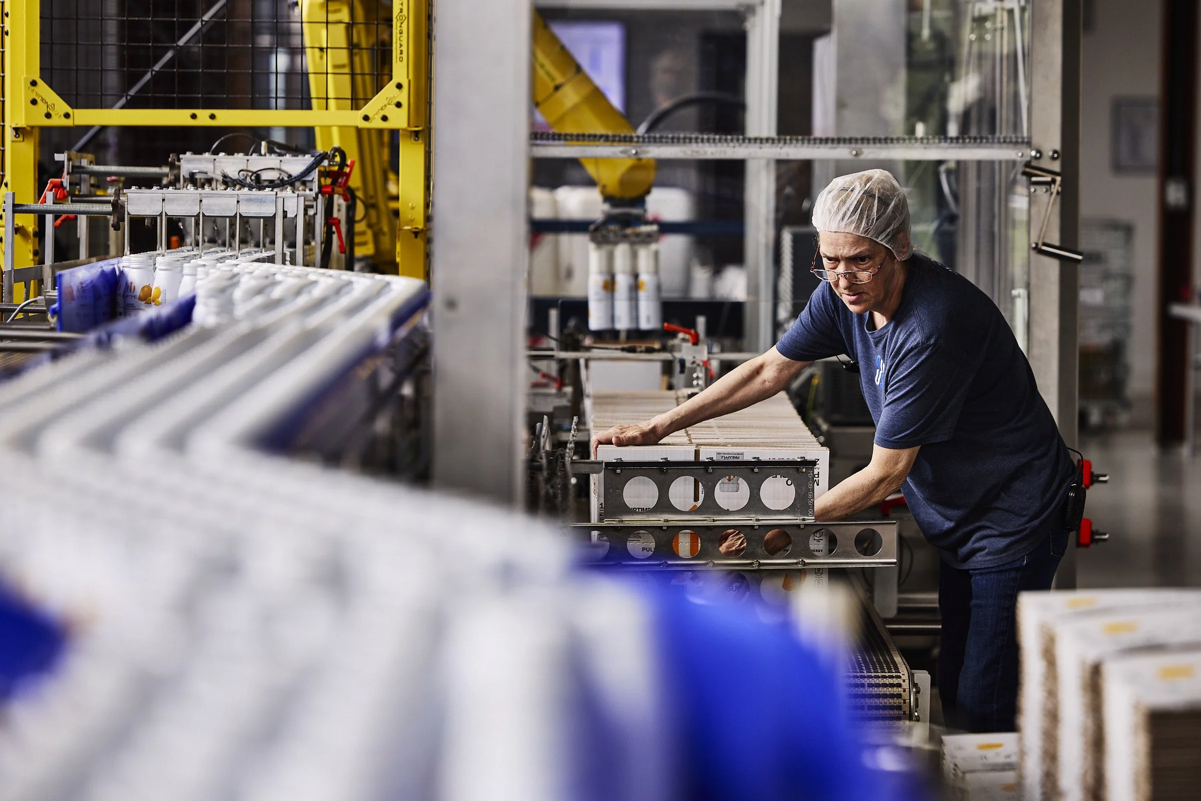 Worker in a hairnet and glasses operating machinery in a manufacturing or packaging facility.