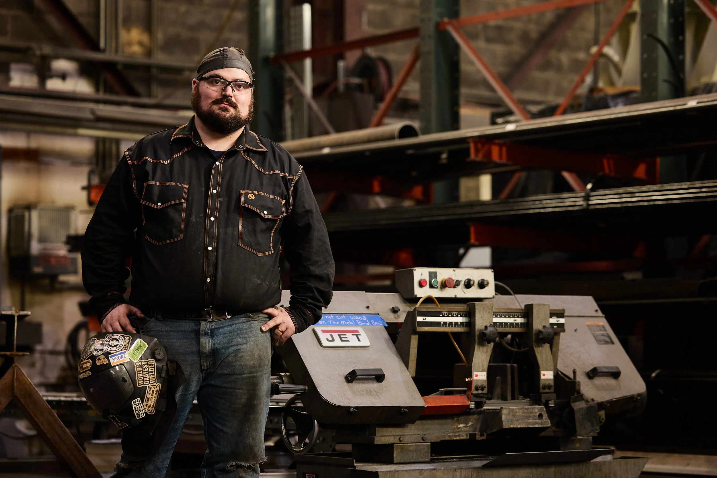 A man with a beard wearing glasses, a black bandana, and a black work jacket stands in a workshop next to a large metal-cutting machine. The workshop has industrial shelving and tools in the background.